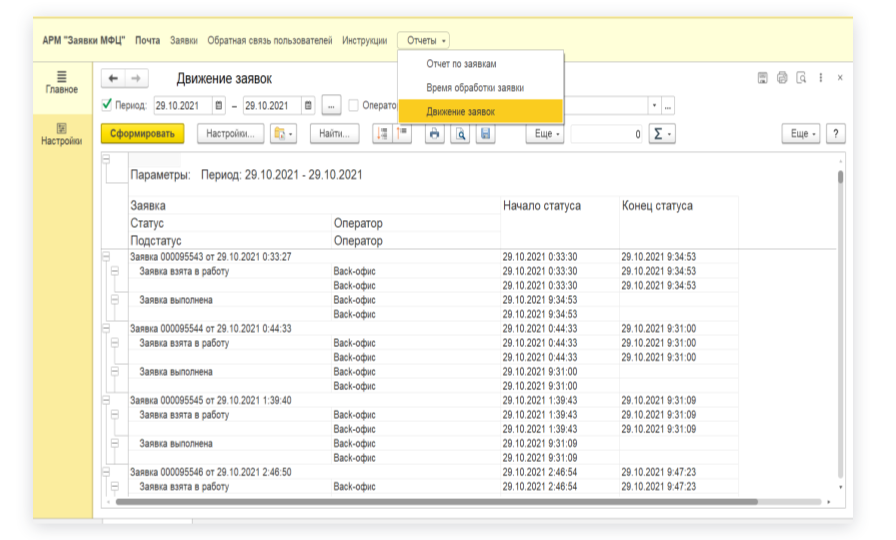- движение заявок в рамках МФЦ.