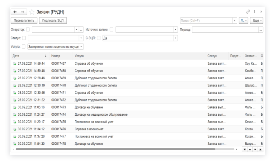 Специально для МФЦ РУДН сделали форму «Список заявок». В ней можно работать со всеми заявками за всё время работы МФЦ. Это даёт возможность посмотреть, какие есть заявки, отфильтровать их, подготовиться к их обработке групповым способом. В том числе — пакетно подписать их ЭЦП.
