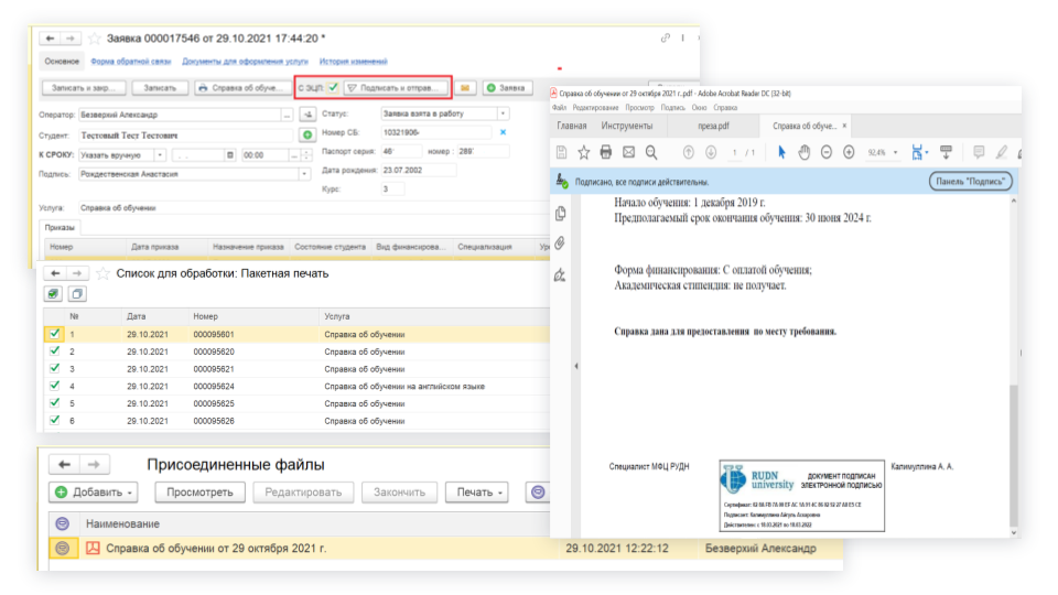 В рамках модуля можно подписывать документы электронной цифровой подписью (ЭЦП). Предусмотрена пакетная обработка документов. Например, необходимо подписать справки для всего курса: благодаря пакетной обработке время на работу с одной справкой значительно снижается. Принцип работы «в один клик» экономит время сотрудников РУДН.