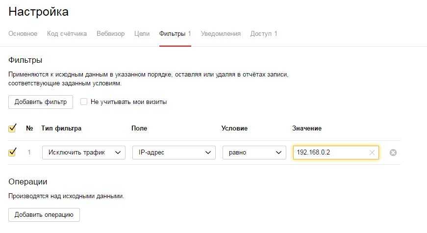- равно. Например, если выбрать последовательно тип фильтра «Оставить только трафик», поле «IP-адрес», условие «равно» и значение 192.168.0.2 — в отчет будут попадать только переходы с этого IP-адреса.