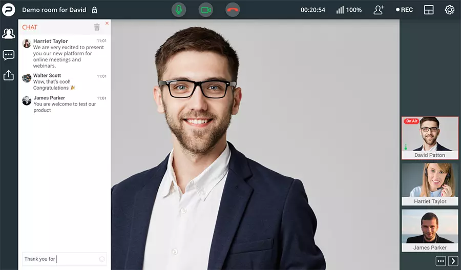 Во время конференции доступен чат участников и все современные возможности для управления. Администратор может выделять спикеров, включать и выключать микрофоны участников. Каждый присоединившийся может включить трансляцию экрана своего гаджета.