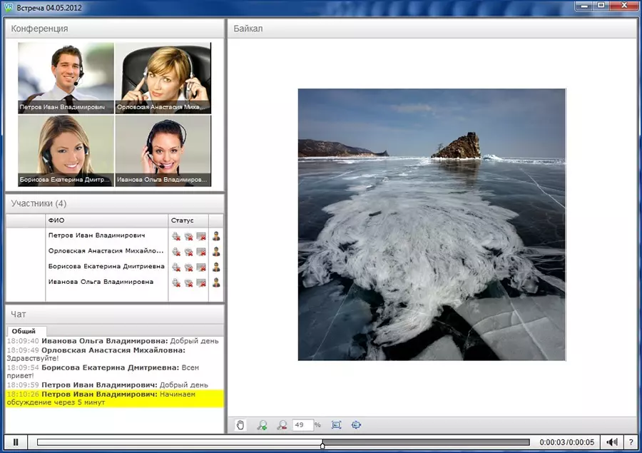 Позволит проводить видеовстречи с 25 участниками, которые могут транслировать видео с веб-камеры, звук с микрофона или действия на дисплее. Каждому человеку можно задать роль, например, администратора.