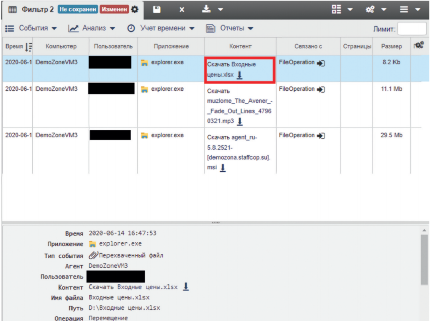 Для списка перехваченных файлов системой StaffCop Enterprise было создано дерево, в котором отражено, какие пользователи работали с файлами и какие операции выполнялись. По этому дереву были определены пользователи, в чьи обязанности не входит работа с данными файлами, а значит сотрудник собирал информацию, к которой он не должен иметь отношения.
