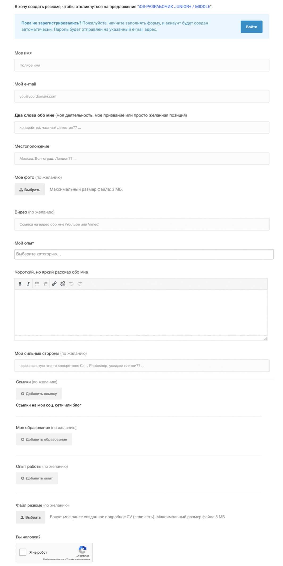 В резюме попросят оставить контактные данные и коротко рассказать о себе. При желании можно оставить ссылку на видеопрезентацию, профиль в соцсети и прикрепить более подробное CV