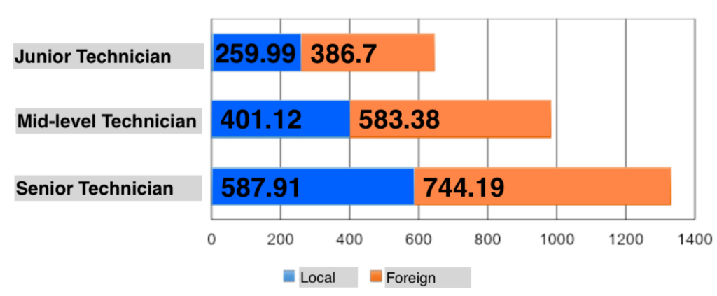 Средняя зарплата в долларах у новичка, специалиста и старшего специалиста в IT. Синим — компании Армении, оранжевым — иностранные