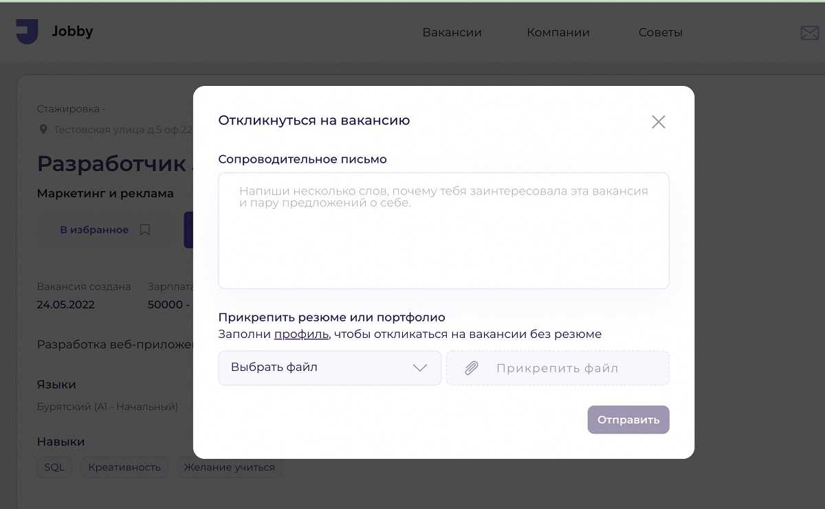 Некоторые вакансии предусматривают отклик только через Jobby ↓