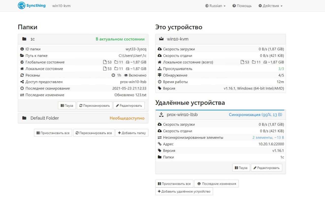 И всё! После этого начинается двухсторонняя синхронизация этой директории. Сюда же можно добавить еще несколько систем. Таким образом все они будут синхронизировать одну и ту же директорию. Если вы не хотите соединяться через публичные релеи, можете поднять свой. Любо просто настраивать подключения по ip.