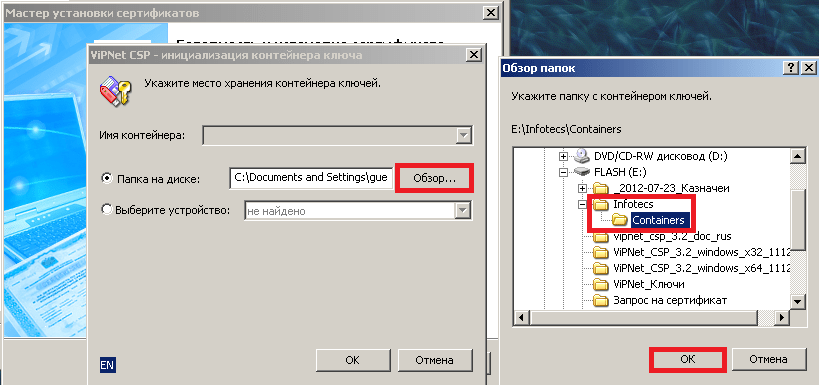 Откроется окно «ViPNet CSP – инициализация контейнера ключа», нажимаете кнопку «Обзор» и указываете путь к контейнеру ключей \Infotecs\Containers, нажимате «ОК»