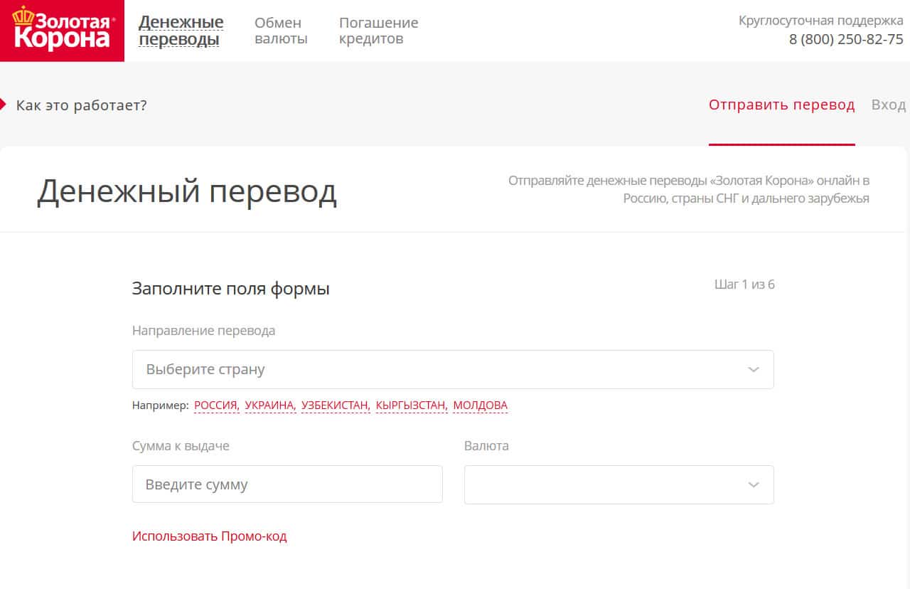 Чтобы сделать транзакцию через сайт, необходимо просто выбрать на главной странице раздел «Денежные переводы»