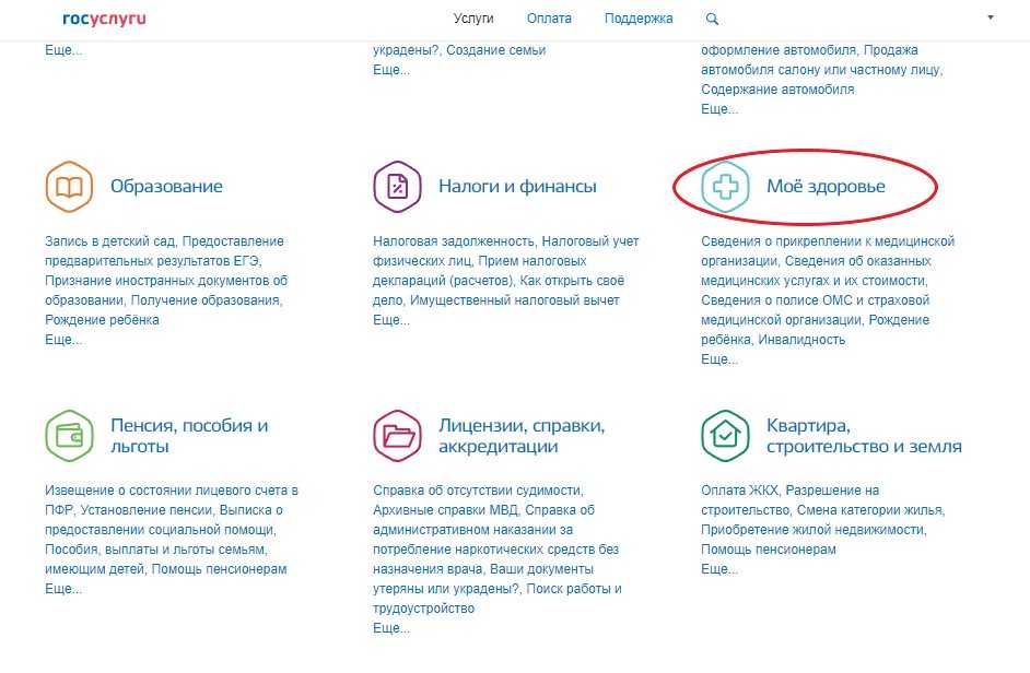 Открывается полный перечень услуг, предоставляемых порталом. Находят раздел «Мое здоровье». Переходят в него.