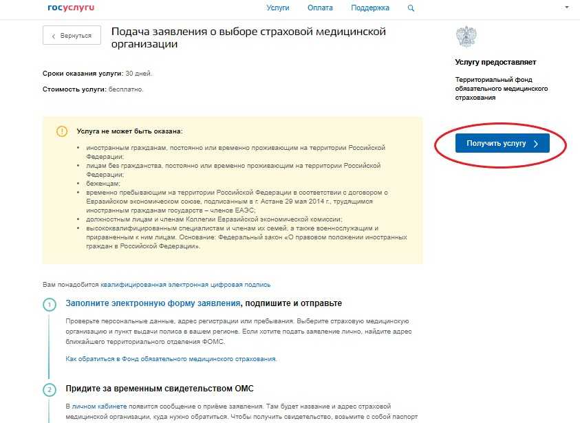 Открывается страница с информацией об услуге. Здесь прописан перечень лиц, для которых оформление полиса невозможно, а также порядок действий для получения документа. После изучения всех сведений, нажимают на кнопку «Получить услугу», расположенную в правой части экрана.