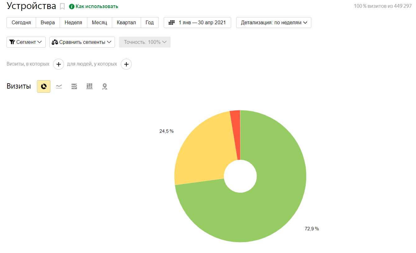 Проблема. За последний год посещаемость лендинга с мобильных устройств увеличилась на 8%. По статистике Яндекс Метрики, доля мобильного трафика за период с мая 2020 года по май 2021 года составила 64,8%, а в 2021 году — 72,9%.