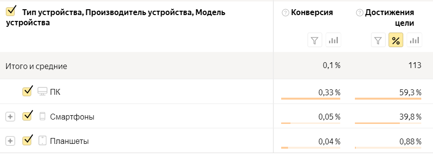 Конверсия в заявку у пользователей, приходящих с мобильных устройств, в среднем была на 20% ниже, чем у посетителей, открывающих сайт с ПК (59,3% против 39,8%).