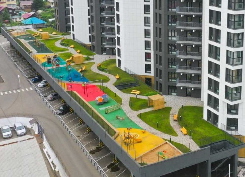 Помимо оригинальной формы домов есть у жилого комплекса еще одна «фишка» — двухуровневый двор. На верхнем уровне расположена терраса с детской площадкой и спортивной зоной, на нижнем — обширная зона парковки, эта территория находится под видеонаблюдением. Благоустроенная детская площадка — это территория без машин, которые физически туда не могут попасть, потому что расположена она на уровне второго этажа.