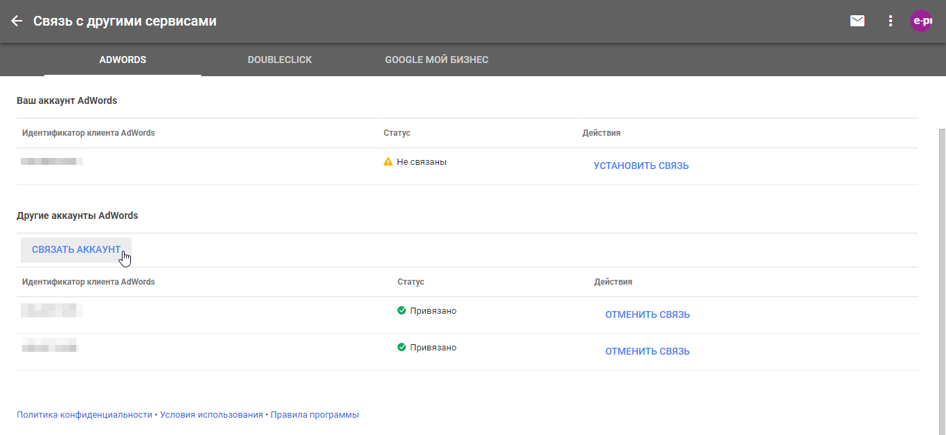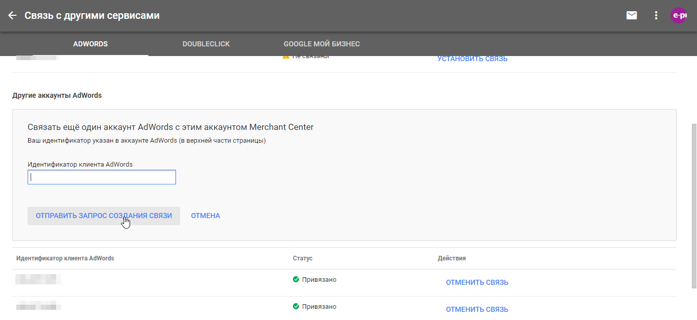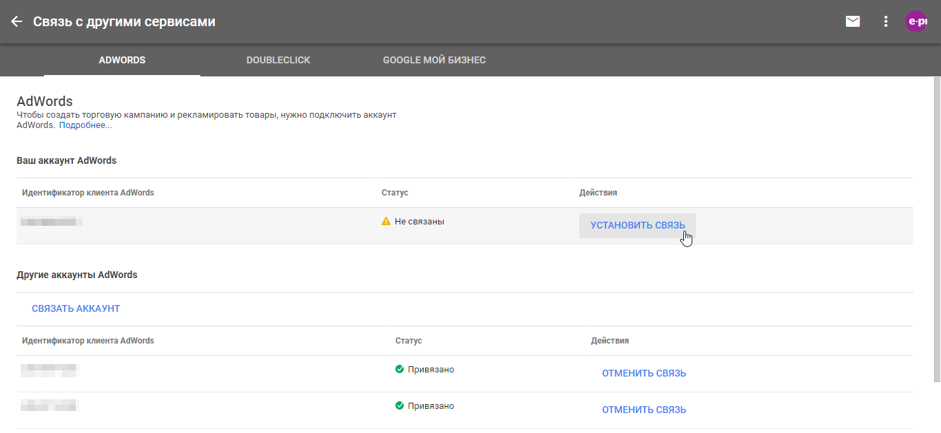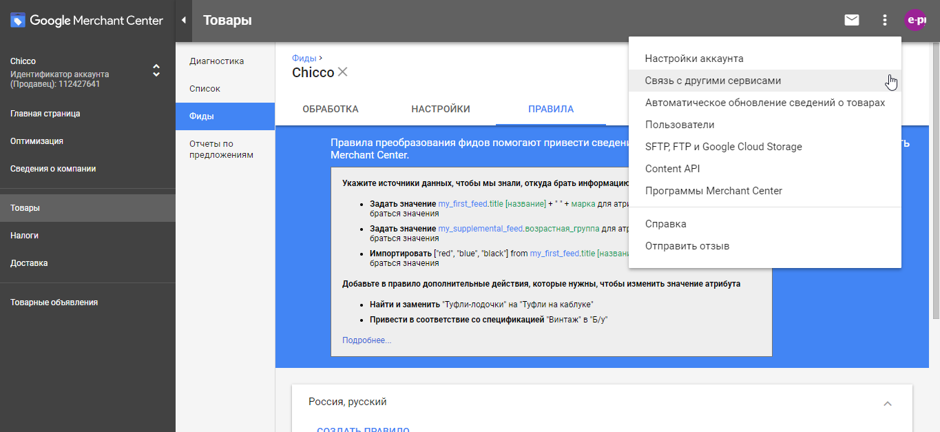 Чтобы привязать Google Merchant Center с рекламным аккаунтом Google Ads, кликаем на шестеренку и выбираем «Связанные аккаунты».