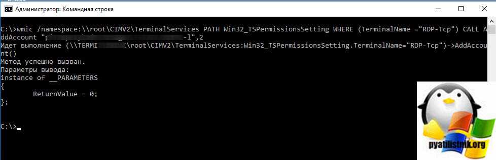 # wmic /namespace:\\root\CIMV2\TerminalServices PATH Win32_TSPermissionsSetting WHERE (TerminalName =»RDP-Tcp») CALL AddAccount ,2