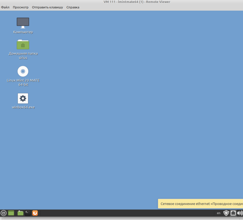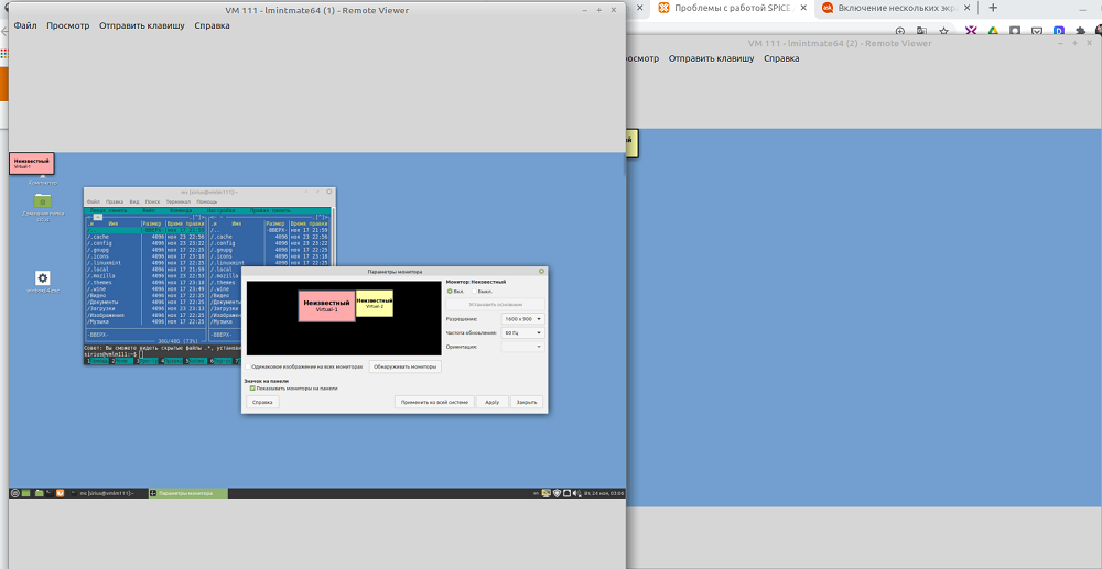 Меню «Просмотр» — задание масштаба отображения рабочего стола и возможность переключиться в полный экран. Также в этом меню можно активировать дополнительные дисплеи если установлен spice dual monitor.