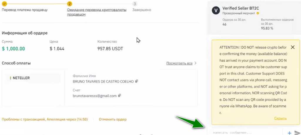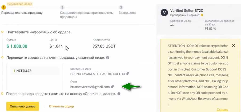 Обратите внимание, что оплата ордера ограничена окном в 30 минут, по истечении которых он будет отменен. Слева указана сумма, которую мы должны перевести Продавцу, и количество USDT, которое поступит на счет уже с вычетом процентов