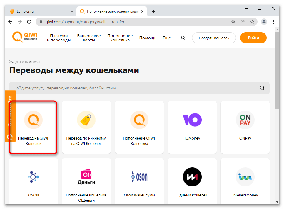 - По умолчанию в списке вариантов отображается кошелек QIWI, поэтому искать его не придется. Кликните на соответствующий пункт на панели слева.
