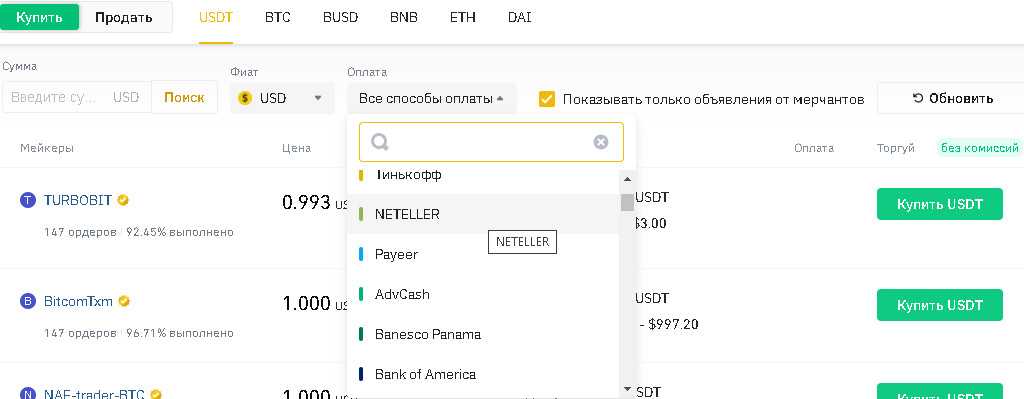 Выбираем направление сделки «Купить», кликаем рядом по «USDT». В строке ниже выбираем вид фиатной валюты «USD», желаемую сумму обмена – $1000 и «Способ оплаты». В приведенном примере будет использована платежная система Neteller.