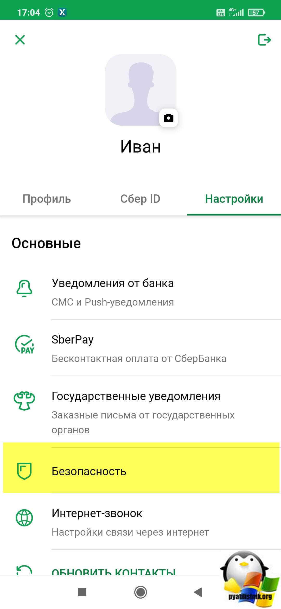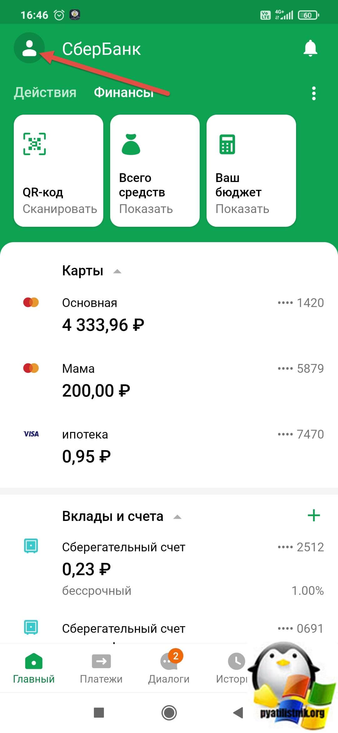 Запускаем приложение Сбербанк, в левом верхнем углу нажмите на иконку с человеком.