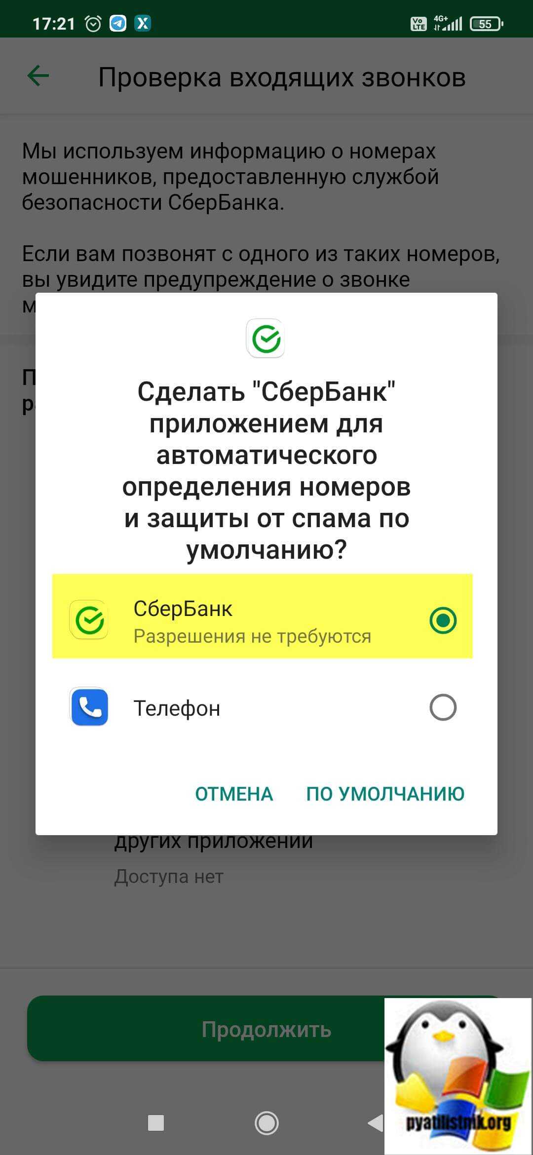 Выбираем в качестве приложения для автоматического определения номеров и защиты от спама по умолчанию «СберБанк».