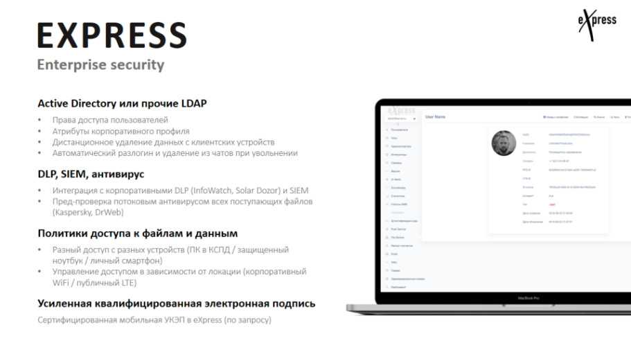 Для сторонних пользователей осуществляется полное скрытие всех данных, и пользователь, не входящий в список сотрудников, увидит только фамилию и имя, а также алиас (то есть псевдоним адреса домена, а не сам URL) корпоративного сервера. С точки зрения защиты реализованы все современные средства: например, трёхслойное шифрование, из них два слоя E2EE на эллиптических кривых. Организованы безопасные пуш-нотификации, без контента и даже мета-данных, по запросам можно сделать шифрование по ГОСТ. Криптостойкость мессенджера eXpress прошла аудит, а безопасность платформы целиком сертифицирована ФСТЭК.