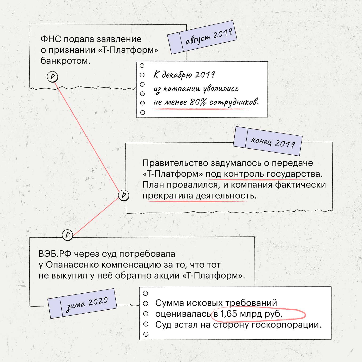 «Т-Платформ». Однако этот план не реализовался, и «Т-Платформы» фактически прекратили свою деятельность. С тех пор ВЭБ.РФ стремилась избавиться от своей доли в компании, а зимой 2020-го через суд потребовала от Опанасенко компенсацию за то, что тот не выкупил у неё обратно акции разработчика суперкомпьютеров. Суд встал на сторону госкорпорации.