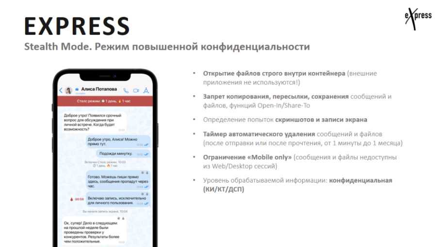 Существует режим повышенной конфиденциальности – работа со скриншотами, таймер удаления, файл доступен только на мобайл-версии. Каждая функция может быть включена для отдельного сообщения или файла.