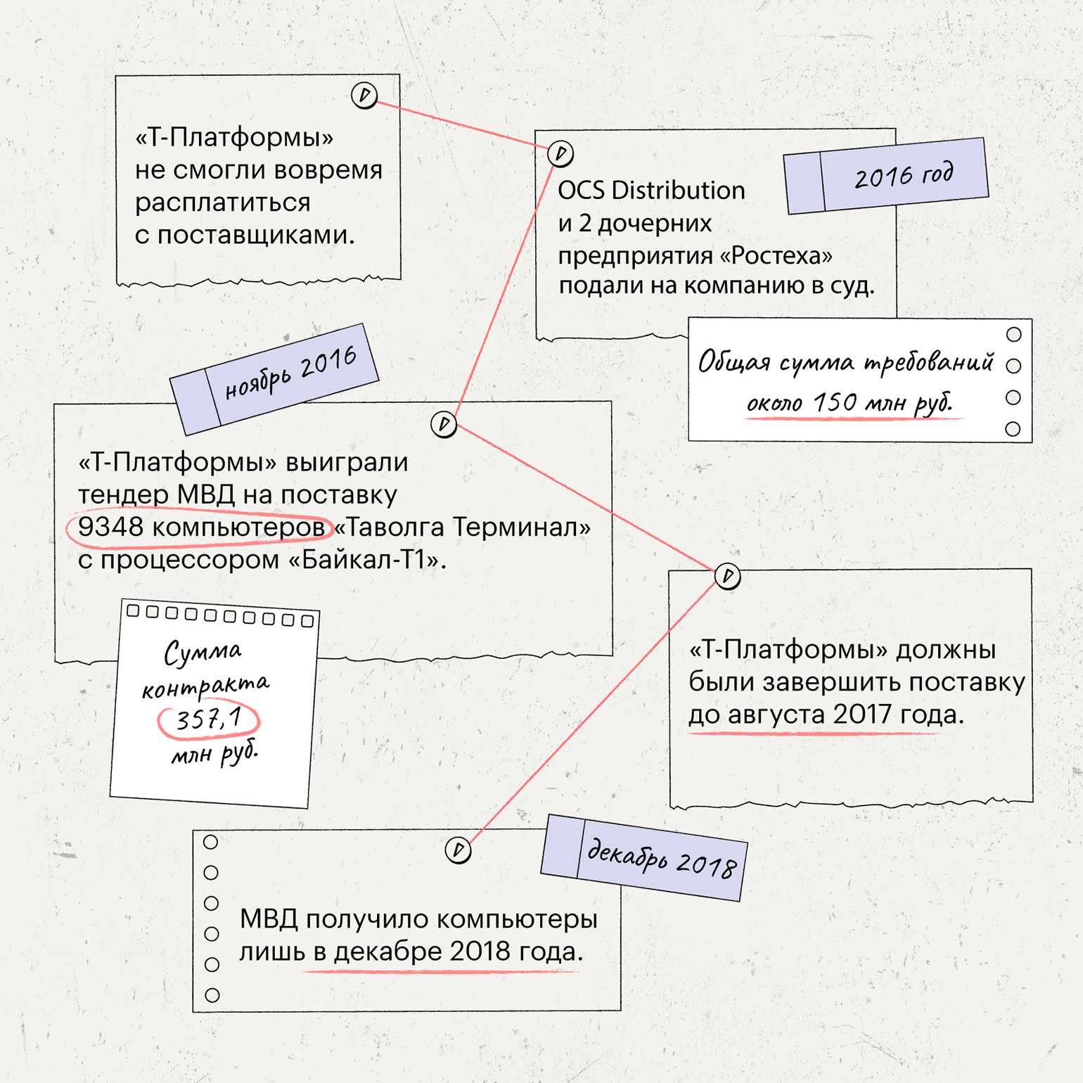 В 2016 году «Т-Платформы» также выиграли тендер Министерства внутренних дел (МВД) на поставку 9348 компьютеров «Таволга Терминал» с отечественным процессором «Байкал-Т1». Предполагалось, что с их помощью будут в том числе принимать экзамены на водительские права. Сумма контракта составила 357,1 млн рублей. Выполнить его должна была «дочка» «Т-Платформ» — компания «Байкал Электроникс». Завершить поставку в установленный срок, до 1 августа 2017 года, разработчик не успел. Как объясняла тогда «Ведомостям» представитель «Т‑Платформ» Елена Чуракова, МВД задержало аванс и не дало компании информации, нужной для выполнения контракта. В итоге поставку осуществили лишь через год, в декабре 2018-го.