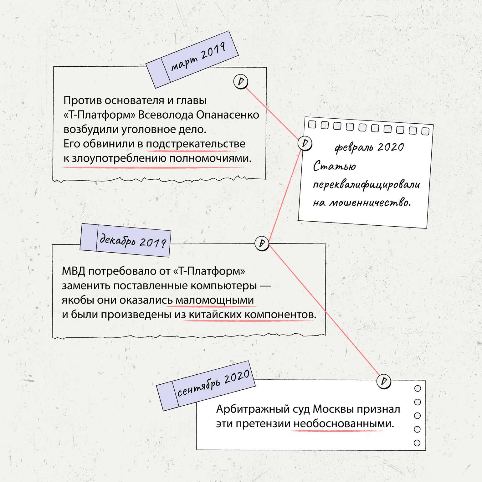 По версии следствия, «Т-Платформы» поставили МВД оборудование, не соответствовавшее техническому заданию: компьютеры оказались маломощными и были произведены не из отечественных, а из китайских компонентов. В декабре 2019 года МВД даже потребовало от компании заменить «Таволги». В сентябре 2020-го Арбитражный суд Москвы признал эти претензии необоснованными, указав на результаты экспертизы и показания свидетелей из различных межрайонных регистрационно-экзаменационных отделов ГИБДД. По их словам, устройства, на которых принимают экзамены на права, были работоспособными.