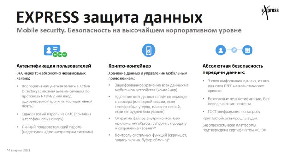 Хранение зашифровано, есть возможность удалить все данные на мобильных устройствах пользователей по команде с сервера – эта функция актуальна, например, в случае утери мобильного телефона с установленным мессенджером либо в случае увольнения сотрудника. Функционал крипто-контейнера позволяет осуществлять открытие всех файлов только внутри корпорации и ставит запрет на передачу данных вовне. Кроме того, eXpress контролирует такие системные функции как скриншоты, буфер обмена и запись экрана. Данный набор является полным аналогом традиционных решений по корпоративной мобильности класса MDM.