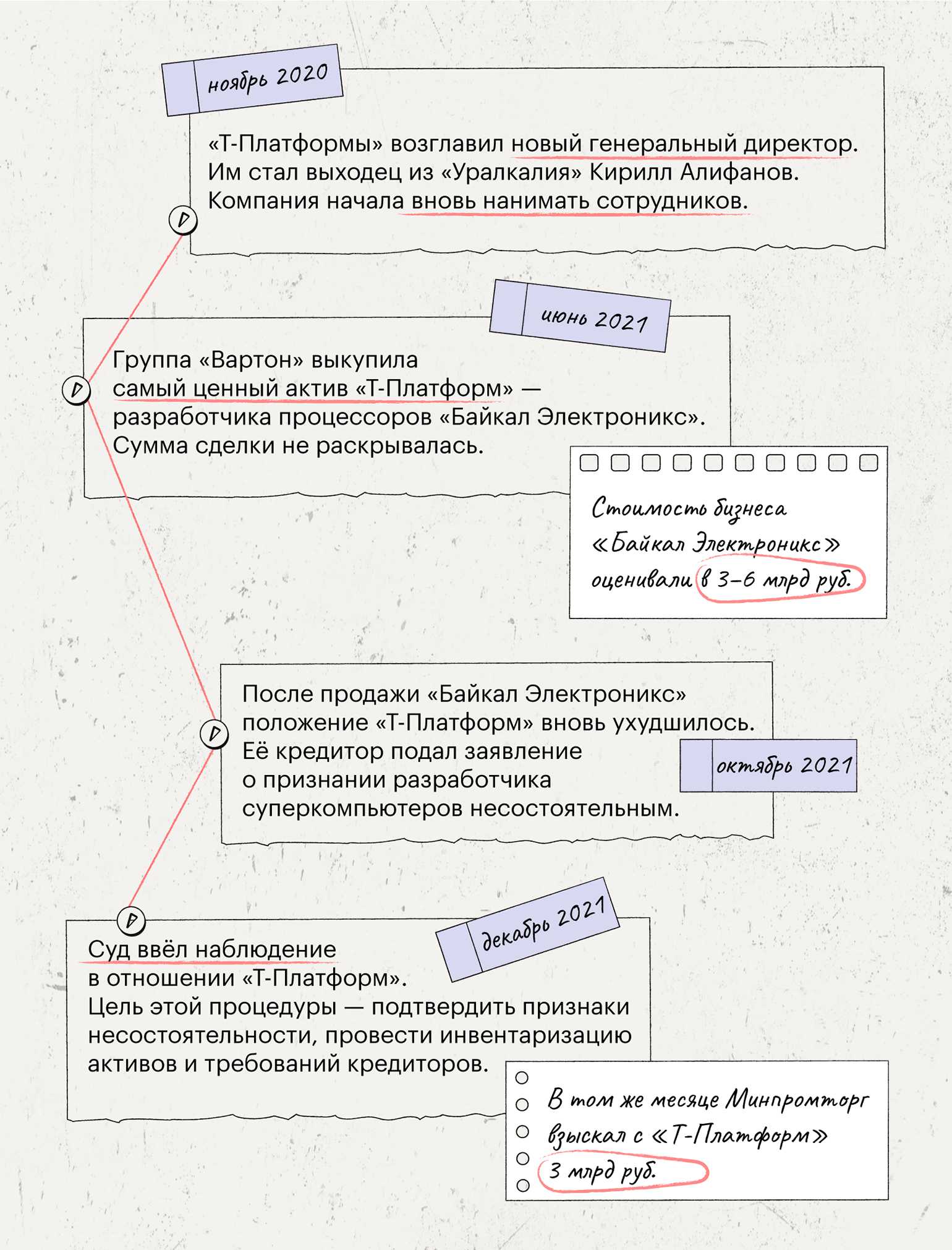 После сделки положение «Т-Платформ» снова ухудшилось. 11 октября 2021 года её кредитор, управляющая компания «РМ-Капитал», подал заявление о признании разработчика суперкомпьютеров несостоятельным. «РМ-Капитал» с дисконтом перекупила права требования долга на 20 млн рублей у другого кредитора