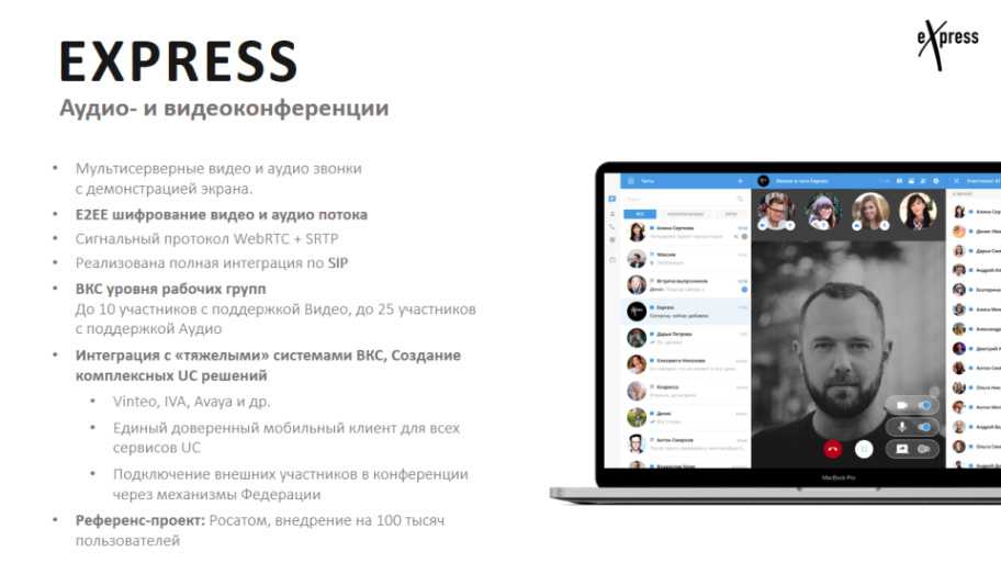 Конференцсвязь eXpress позволяет реализовать конференцию до 10 участников с поддержкой видео и до 25 участников – с поддержкой аудио.