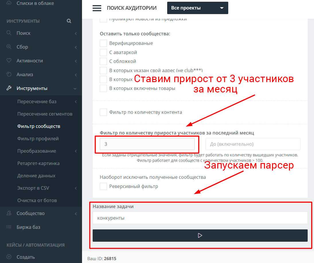 Даем задаче понятное название и запускаем. У нас получится база сообществ конкурентов. Теперь нужно отфильтровать и в дальнейшем только активные сообщества (в тех, где регулярно выходят посты).