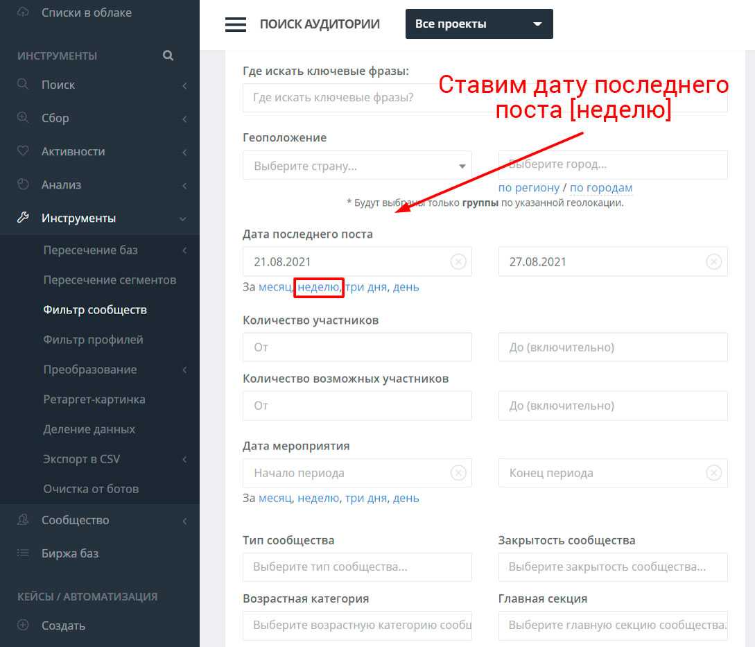 Ставим дату последнего поста неделю и прирост от 3 участников за месяц.