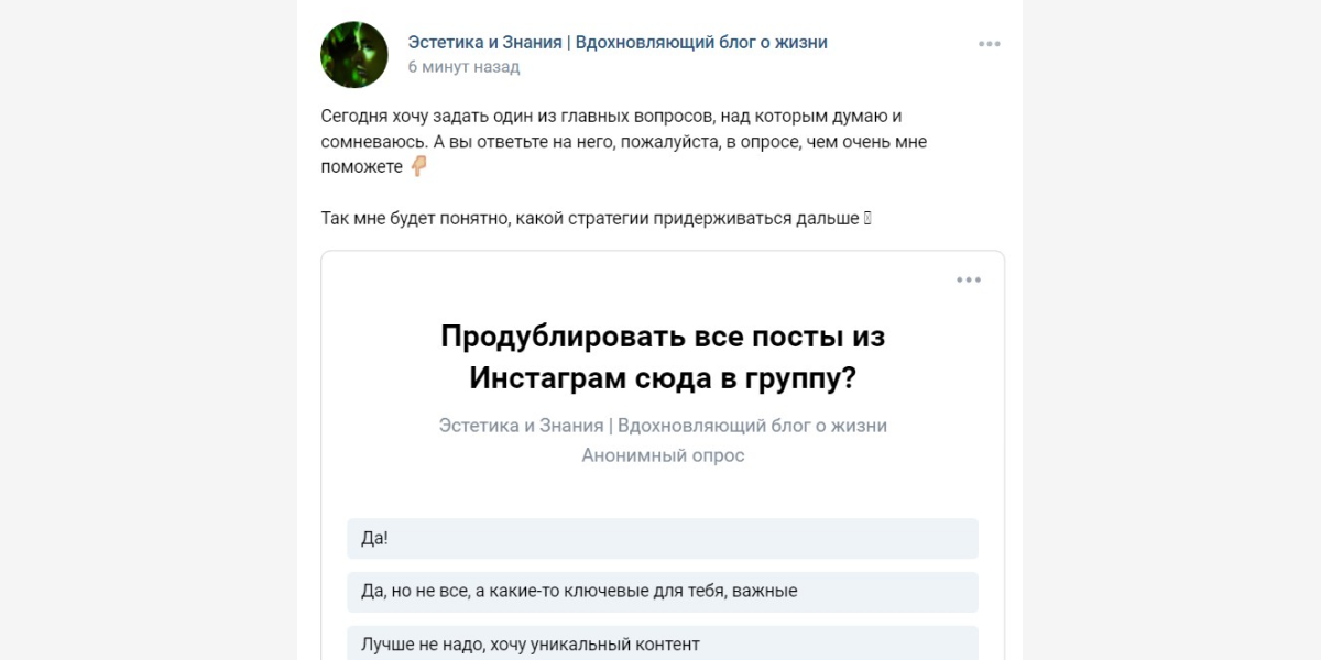 Спросите свою аудиторию, что она хотела бы видеть именно сейчас. Сделать это можно с помощью опроса внутри ВК – такой функционал на площадке есть.