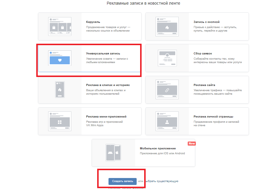 Так выглядит интерфейс рекламного кабинета при создании объявления. Выбираем универсальную запись и нажимаем «Создать запись».