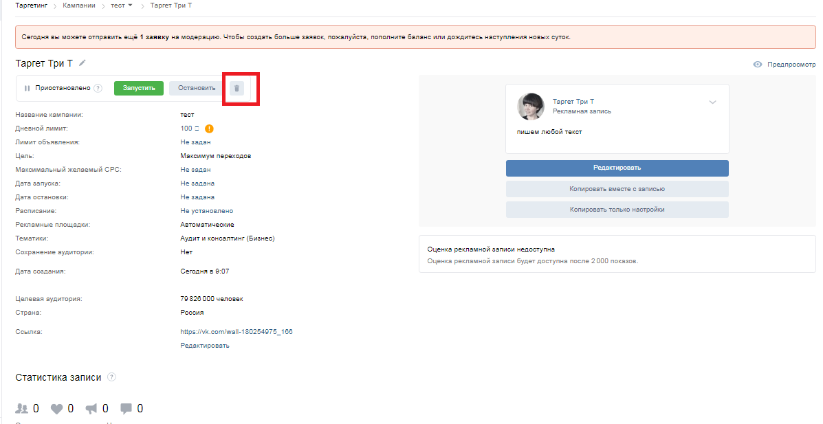 Готово! У нас есть первое рекламное объявление. Оно нам больше не нужно и его можно сразу удалить, нажав на иконку.