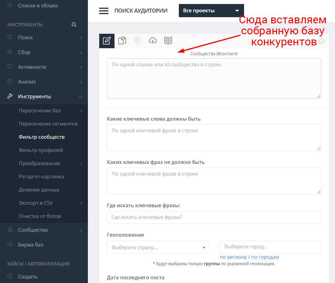 Идем во вкладку «Инструменты — Фильтр сообществ» и во входных данных ставим собранную нами базу сообществ конкурентов.