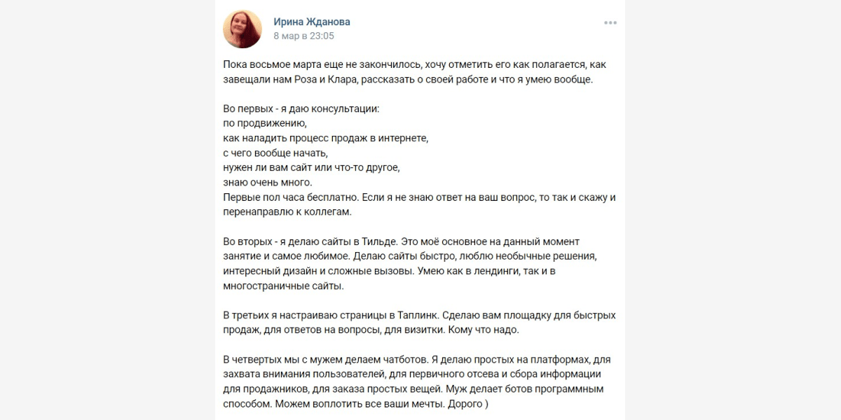 Покажите человеческое лицо. Площадка для вас либо новая, либо просто непривычная и необжитая – явно вас знают здесь далеко не все. Расскажите о своих профессиональных компетенциях просто, тепло, без оглядки на будущие продажи – покажите человеческое лицо