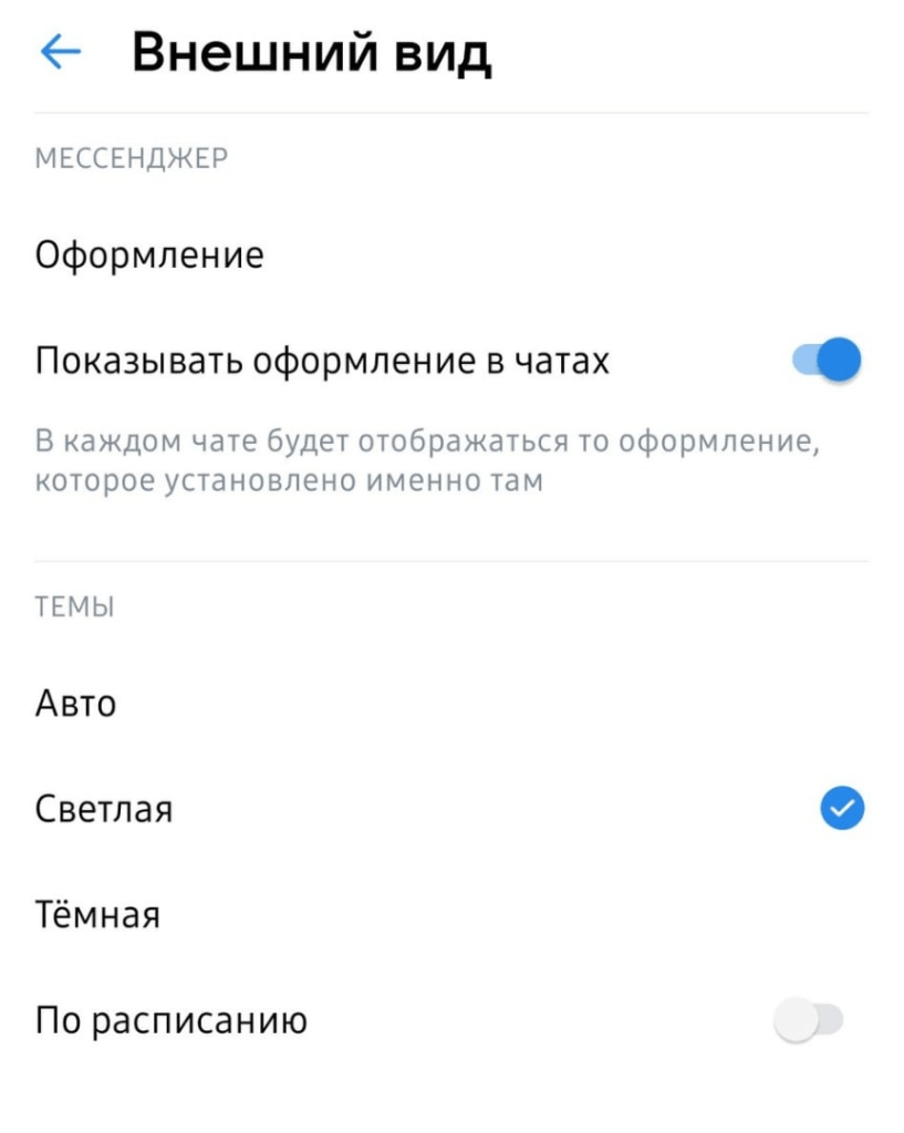 - «Темы»: авто (меняется с восходом и заходом солнца), светлая, тёмная или по расписанию (как системная).