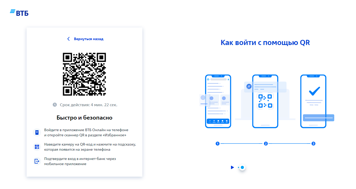 Для идентификации через QR нужно установить приложение для смартфона – ВТБ Онлайн, а затем:
