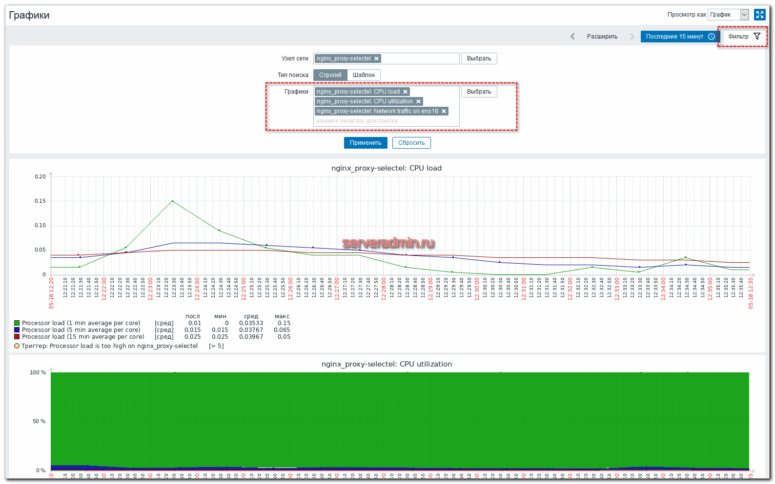 Для того, чтобы посмотреть на одном экране набор произвольных графиков хотса, надо перейти в Узлы сети, открыть графики конкретного хоста. Затем перейти в Фильтр и там выбрать необходимые графики. Стало удобно.