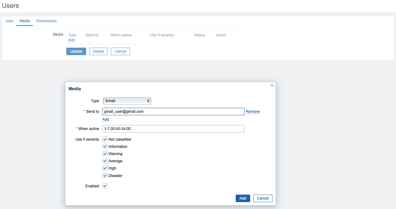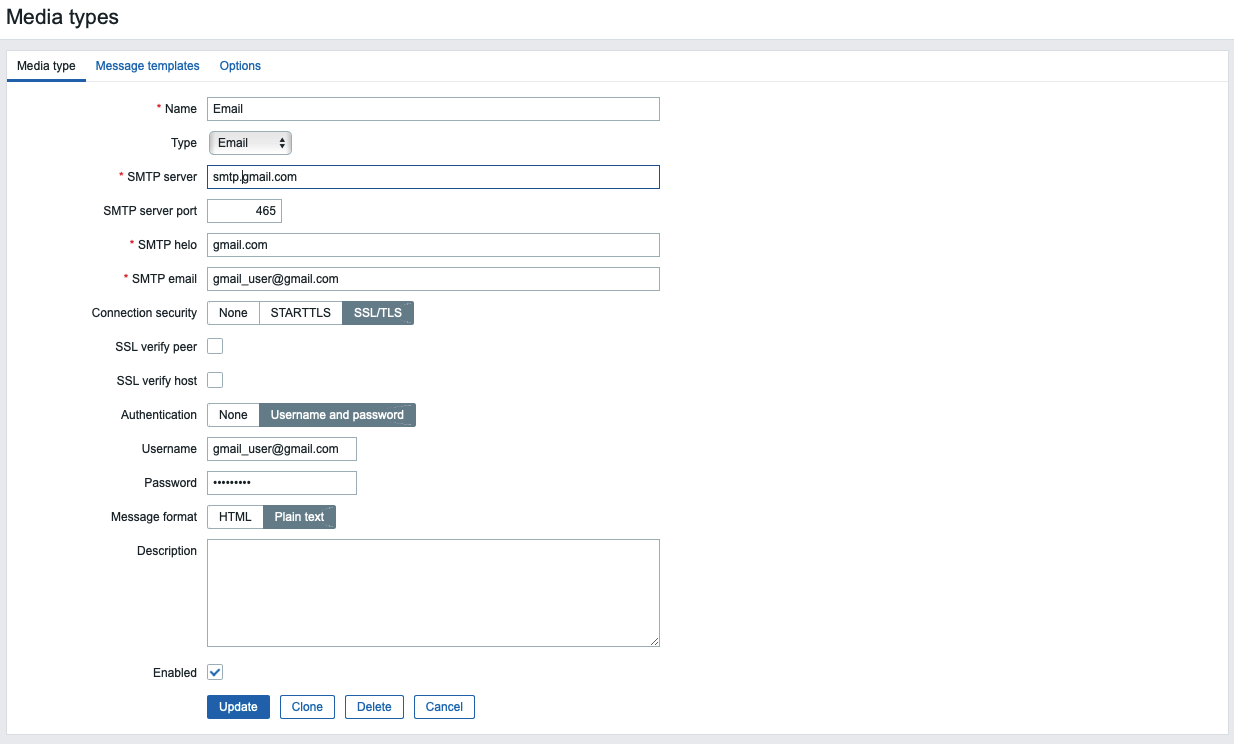 Примечание. Если вы используете двухэтапную аутентификацию для Gmail, необходимо сгенерировать пароль приложения для Zabbix. Пароль приложения вводится только один раз во время установки. Инструкции по генерированию этого пароля можно получить в Справочном центре Google.