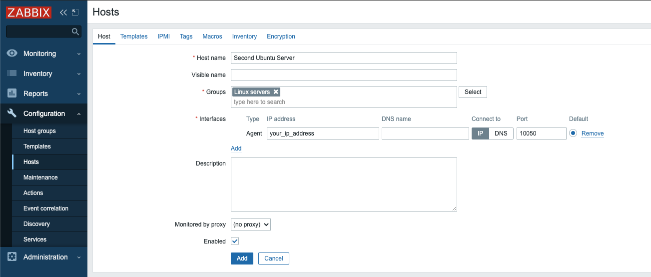 Настройте Имя хоста и IP-адрес, чтобы они отображали имя хоста и IP-адрес вашего второго сервера Ubuntu, а затем добавьте хост в группу. Вы можете выбрать существующую группу, например серверы Linux, или создать собственную группу. Хост может быть в нескольких группах. Для этого введите имя существующей или новой группы в поле Groups (Группы) и выберите желаемое значение из предлагаемого списка.