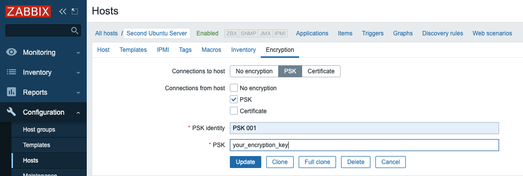 Затем перейдите на вкладку Encryption (Шифрование). Выберите PSK для Connections to host (Входящие соединения на хост) и Connections from host (Исходящие соединения от хоста). Затем установите в PSK identity (Идентификация PSK) настройку , которая является значением настройки TLSPSKIdentity агента Zabbix, настроенного ранее. Затем установите значение PSK для ключа, который вы сгенерировали для агента Zabbix. Он хранится в файле на компьютере агента.