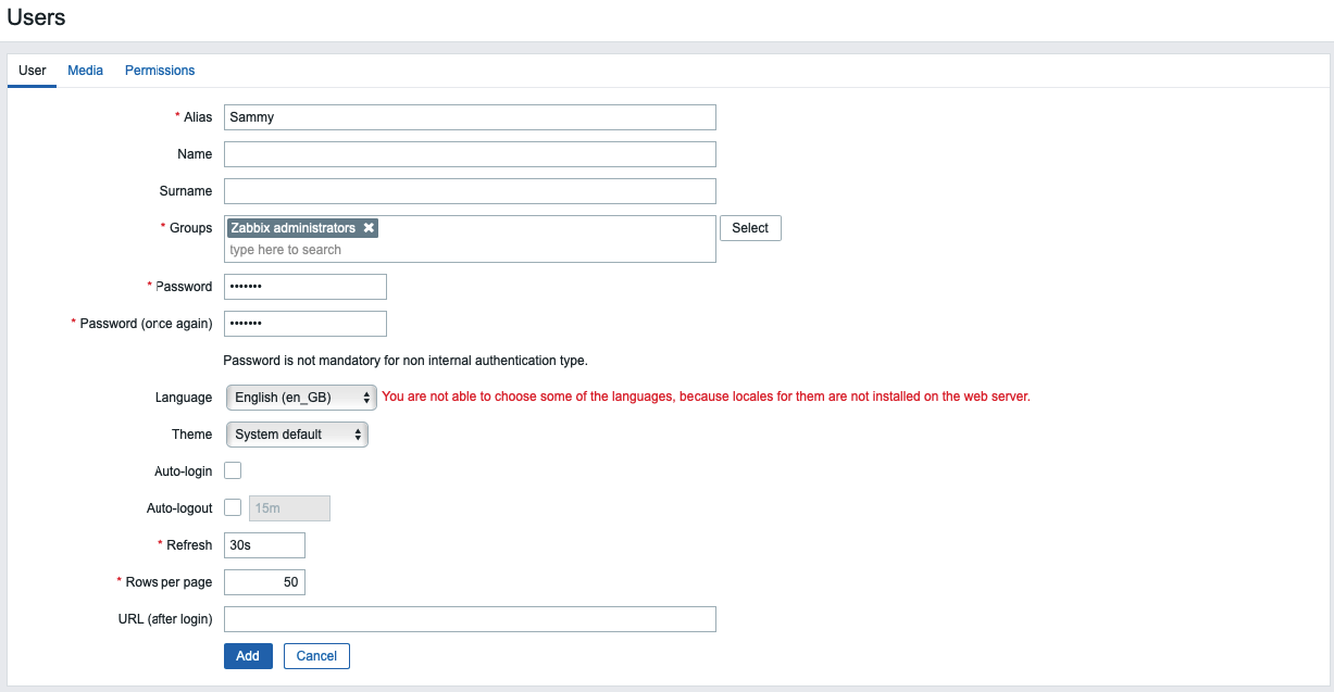 Теперь перейдите на вкладку Permissions (Разрешения). Выберите Zabbix Super Admin (Суперадминистратор Zabbix) из выпадающего меню поля User type (Тип пользователя).
