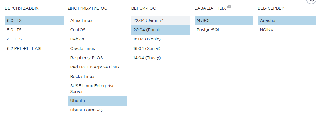 Zabbix доступен в репозиториях пакетов Ubuntu, но я рекомендую использовать официальный репозиторий Zabbix. Для подключения официальных репозиториев вам нужно перейти на страницу загрузки Zabbix и выбрать вашу конфигурацию. Моя конфигурация на скриншоте: