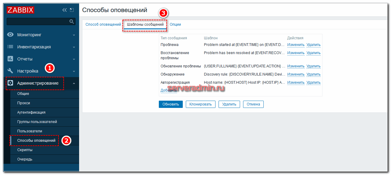 Настройка шаблонов оповещений теперь находится в способах оповещений. Все старые шаблоны, что были в действиях, удалены. Так что сохраняйте их перед обновлением.